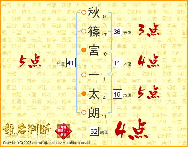 秋(9画)篠(17画)宮(10画) 一(1画)太(4画)朗(11画)