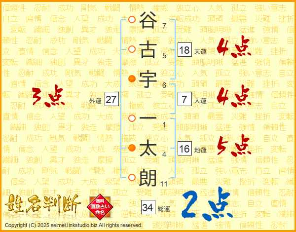 谷(7画)古(5画)宇(6画) 一(1画)太(4画)朗(11画)