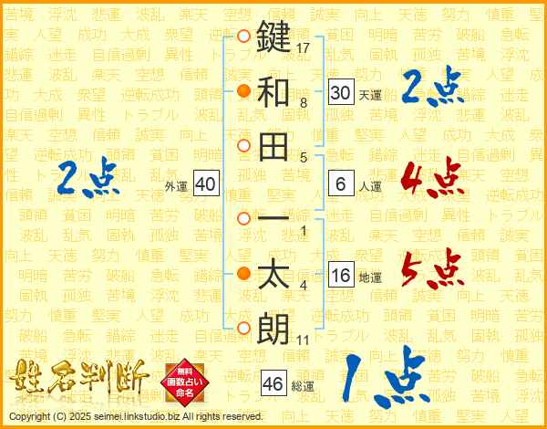 鍵(17画)和(8画)田(5画) 一(1画)太(4画)朗(11画)