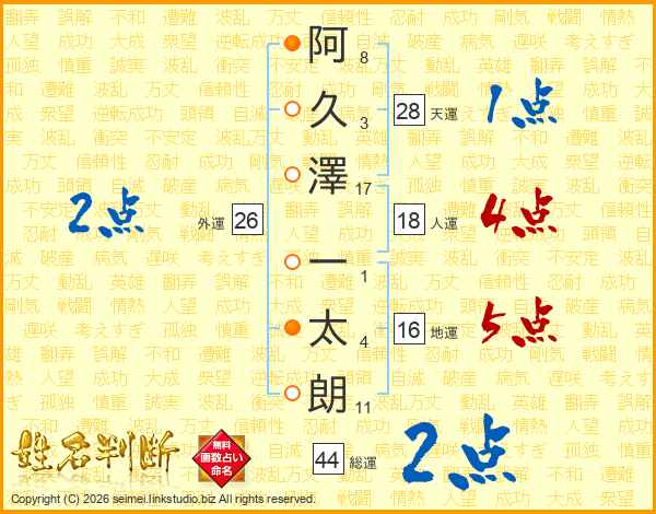 阿(8画)久(3画)澤(17画) 一(1画)太(4画)朗(11画)