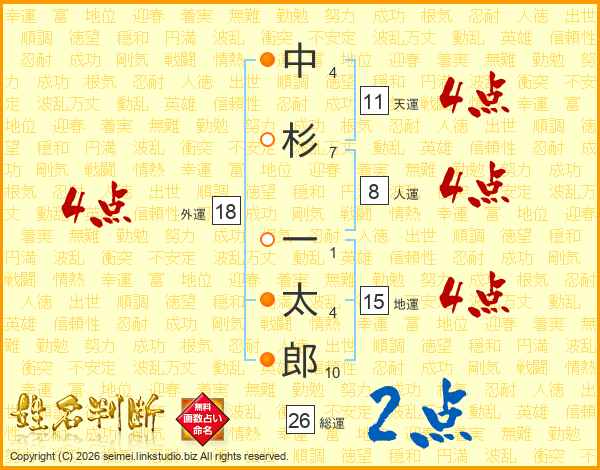 中(4画)杉(7画) 一(1画)太(4画)郎(10画)