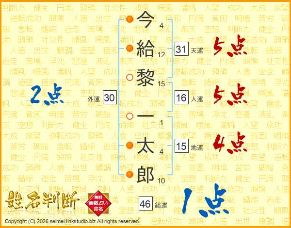 今(4画)給(12画)黎(15画) 一(1画)太(4画)郎(10画)