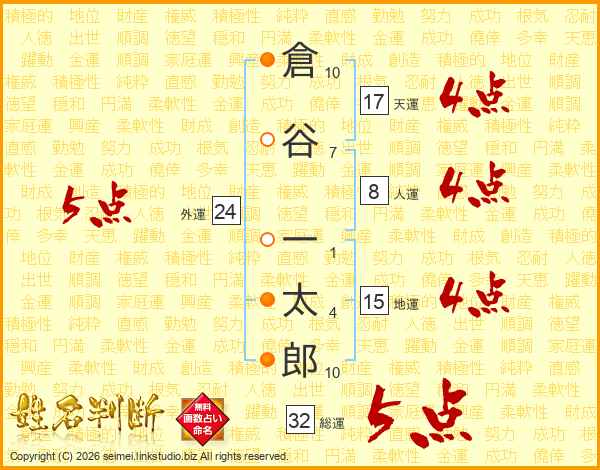 倉(10画)谷(7画) 一(1画)太(4画)郎(10画)
