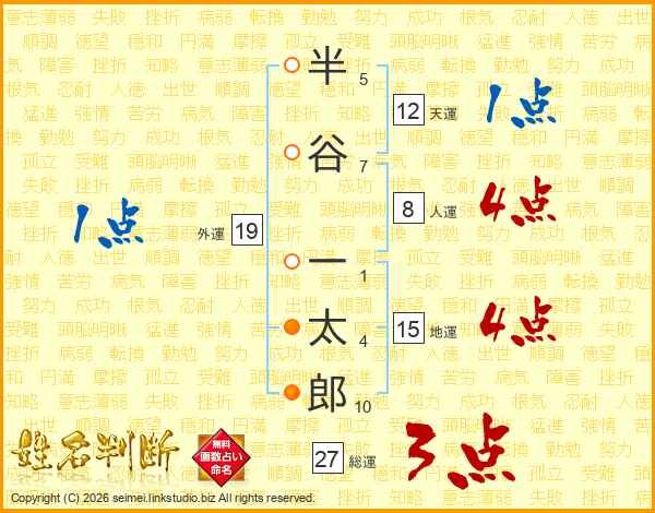 半(5画)谷(7画) 一(1画)太(4画)郎(10画)