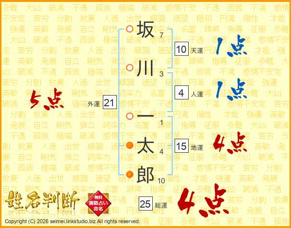 坂(7画)川(3画) 一(1画)太(4画)郎(10画)