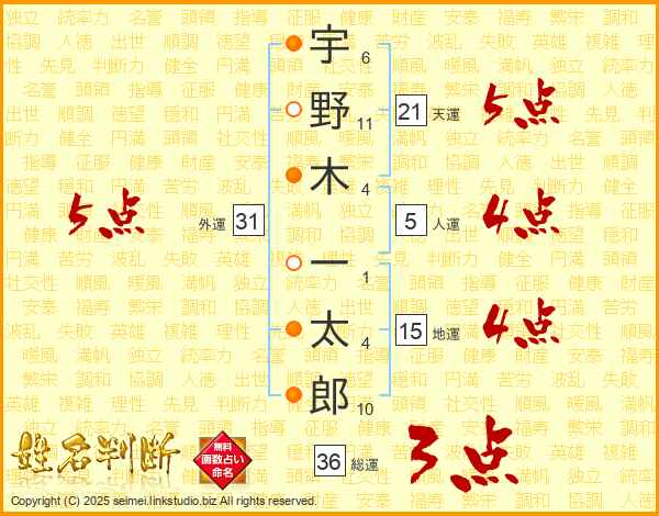宇(6画)野(11画)木(4画) 一(1画)太(4画)郎(10画)