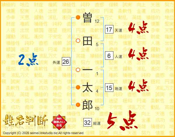 曽(12画)田(5画) 一(1画)太(4画)郎(10画)