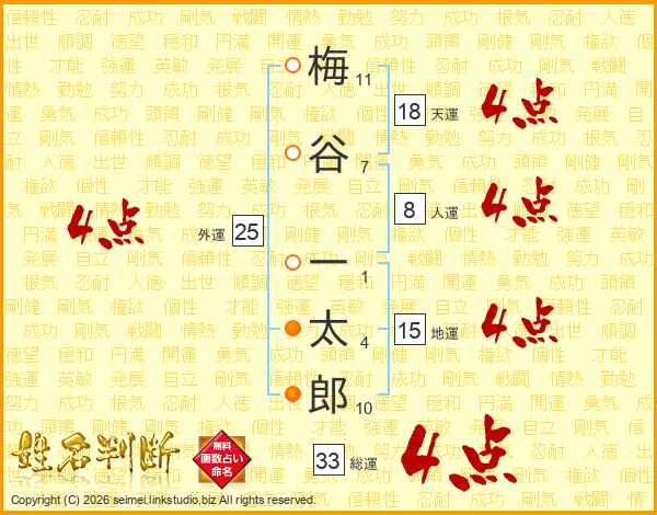 梅(11画)谷(7画) 一(1画)太(4画)郎(10画)
