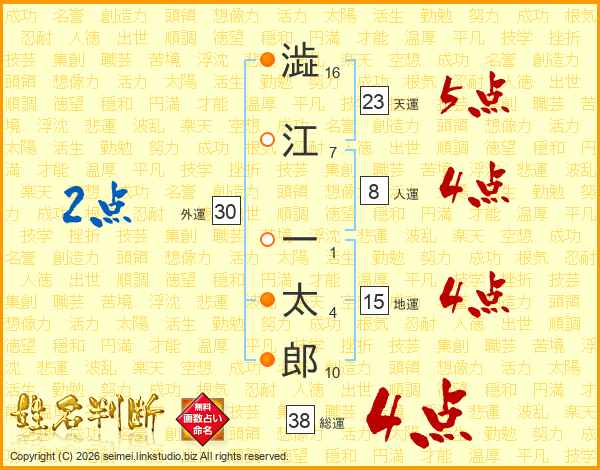澁(16画)江(7画) 一(1画)太(4画)郎(10画)