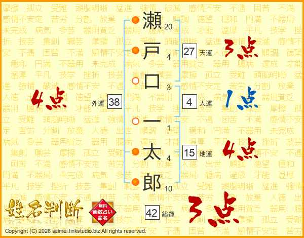 瀬戸口一太郎さんの外運は38画の4点!