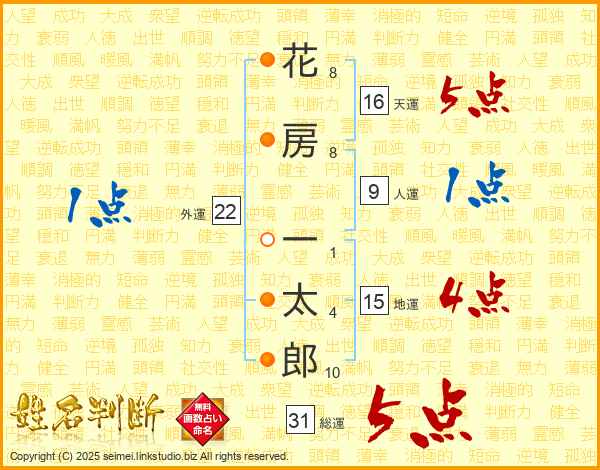 花(8画)房(8画) 一(1画)太(4画)郎(10画)
