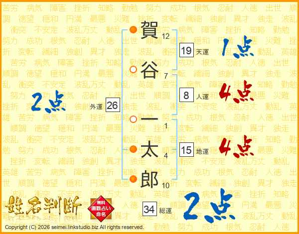 賀(12画)谷(7画) 一(1画)太(4画)郎(10画)