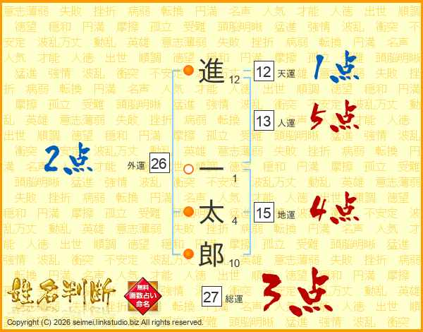 あなたの人生を表す1番重要な運勢です。生涯を通じて影響する総合運となり、主に50歳以降の晩年期に影響を及ぼします。苗字と名前の合計画数。