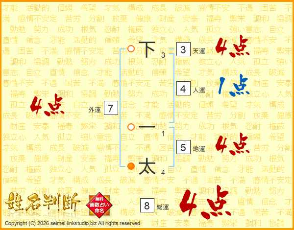 生活面を象徴する運勢です。外部から受ける影響力を表し、結婚運、家庭運や職場、環境への順応性を表します。総運から人運を引いた画数。姓や名が1文字の場合を除く。