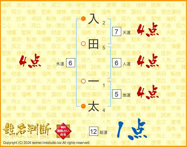 生活面を象徴する運勢です。外部から受ける影響力を表し、結婚運、家庭運や職場、環境への順応性を表します。総運から人運を引いた画数。姓や名が1文字の場合を除く。