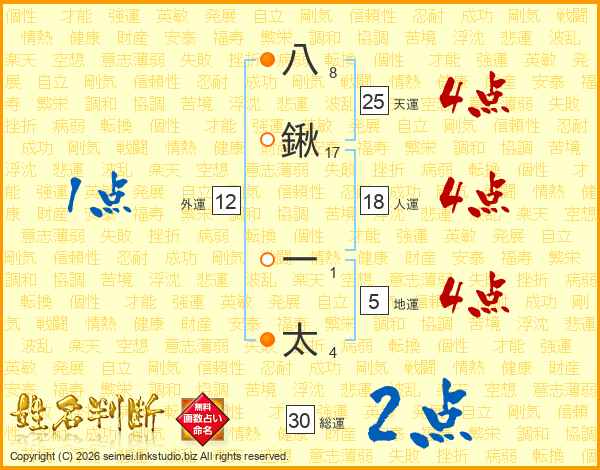 あなたの人生を表す1番重要な運勢です。生涯を通じて影響する総合運となり、主に50歳以降の晩年期に影響を及ぼします。苗字と名前の合計画数。
