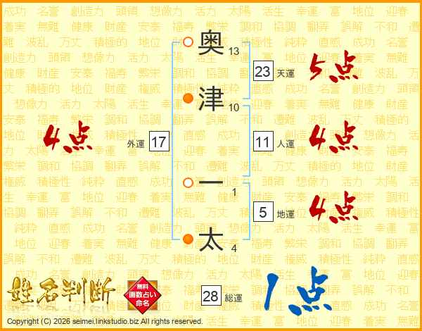 奥(13画)津(10画) 一(1画)太(4画)