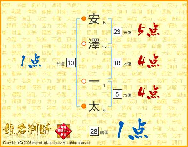 生活面を象徴する運勢です。外部から受ける影響力を表し、結婚運、家庭運や職場、環境への順応性を表します。総運から人運を引いた画数。姓や名が1文字の場合を除く。