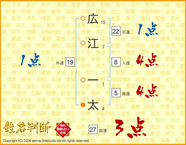 生活面を象徴する運勢です。外部から受ける影響力を表し、結婚運、家庭運や職場、環境への順応性を表します。総運から人運を引いた画数。姓や名が1文字の場合を除く。