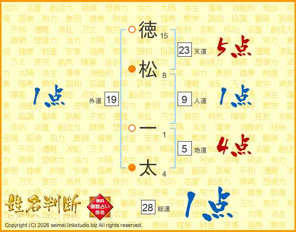 生活面を象徴する運勢です。外部から受ける影響力を表し、結婚運、家庭運や職場、環境への順応性を表します。総運から人運を引いた画数。姓や名が1文字の場合を除く。