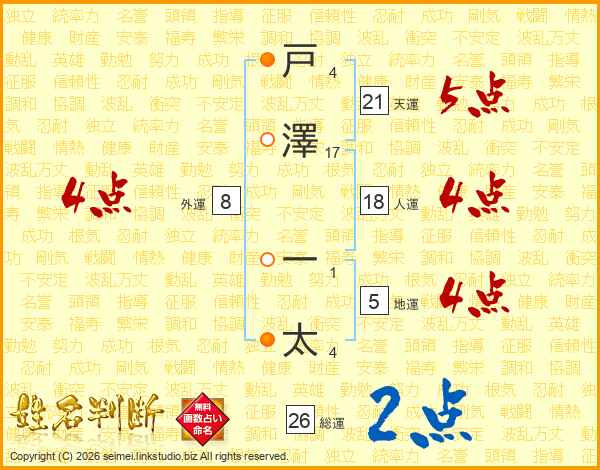生活面を象徴する運勢です。外部から受ける影響力を表し、結婚運、家庭運や職場、環境への順応性を表します。総運から人運を引いた画数。姓や名が1文字の場合を除く。