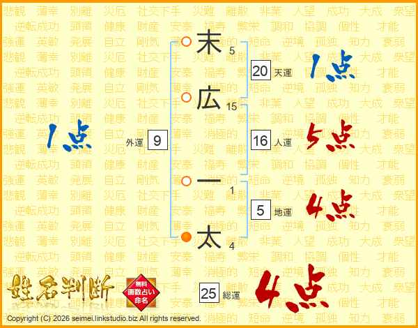 生活面を象徴する運勢です。外部から受ける影響力を表し、結婚運、家庭運や職場、環境への順応性を表します。総運から人運を引いた画数。姓や名が1文字の場合を除く。