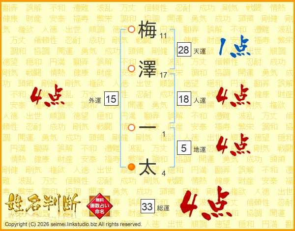 生活面を象徴する運勢です。外部から受ける影響力を表し、結婚運、家庭運や職場、環境への順応性を表します。総運から人運を引いた画数。姓や名が1文字の場合を除く。