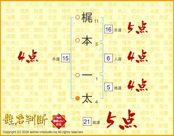 あなたの人生を表す1番重要な運勢です。生涯を通じて影響する総合運となり、主に50歳以降の晩年期に影響を及ぼします。苗字と名前の合計画数。