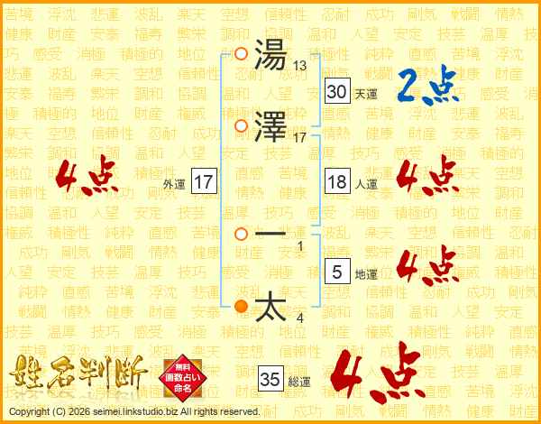 湯(13画)澤(17画) 一(1画)太(4画)