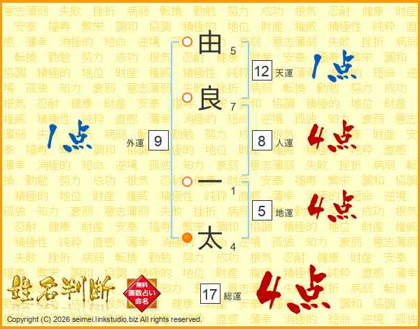 生活面を象徴する運勢です。外部から受ける影響力を表し、結婚運、家庭運や職場、環境への順応性を表します。総運から人運を引いた画数。姓や名が1文字の場合を除く。