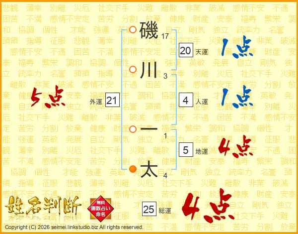 生活面を象徴する運勢です。外部から受ける影響力を表し、結婚運、家庭運や職場、環境への順応性を表します。総運から人運を引いた画数。姓や名が1文字の場合を除く。