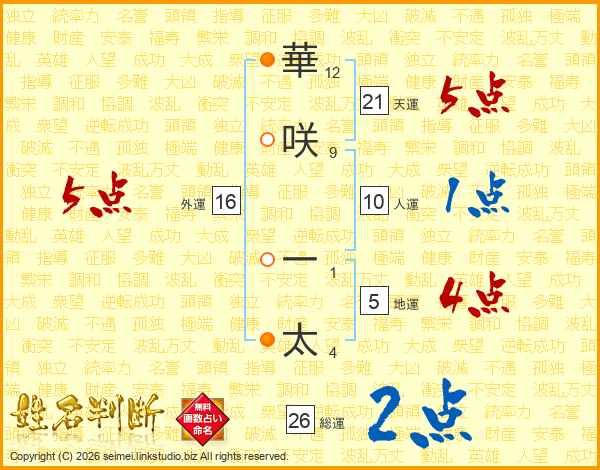 あなたの人生を表す1番重要な運勢です。生涯を通じて影響する総合運となり、主に50歳以降の晩年期に影響を及ぼします。苗字と名前の合計画数。