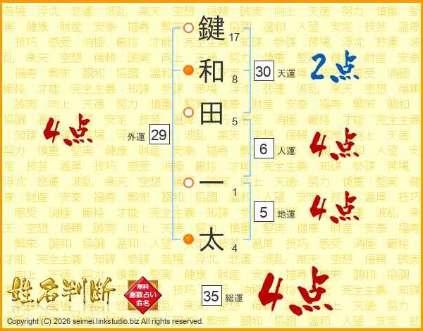 鍵(17画)和(8画)田(5画) 一(1画)太(4画)