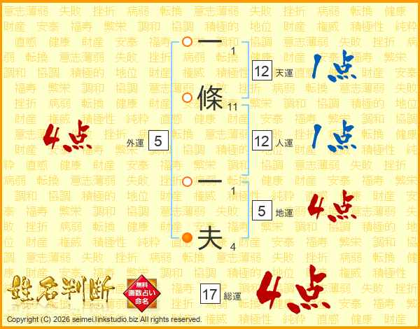 あなたの人生を表す1番重要な運勢です。生涯を通じて影響する総合運となり、主に50歳以降の晩年期に影響を及ぼします。苗字と名前の合計画数。