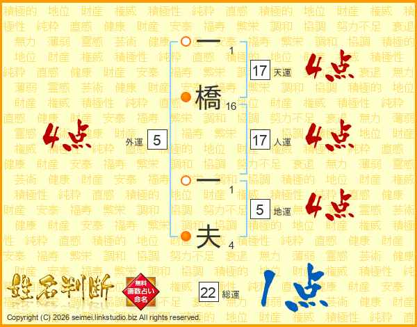 生活面を象徴する運勢です。外部から受ける影響力を表し、結婚運、家庭運や職場、環境への順応性を表します。総運から人運を引いた画数。姓や名が1文字の場合を除く。