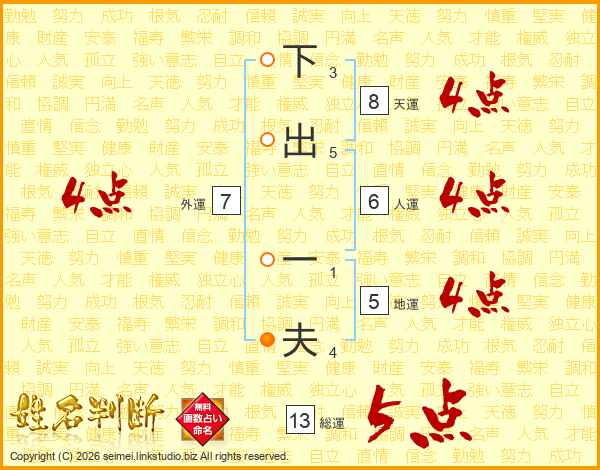 生活面を象徴する運勢です。外部から受ける影響力を表し、結婚運、家庭運や職場、環境への順応性を表します。総運から人運を引いた画数。姓や名が1文字の場合を除く。