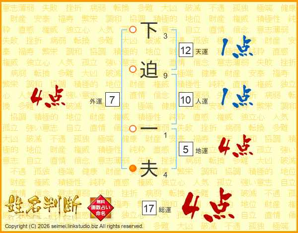 生活面を象徴する運勢です。外部から受ける影響力を表し、結婚運、家庭運や職場、環境への順応性を表します。総運から人運を引いた画数。姓や名が1文字の場合を除く。
