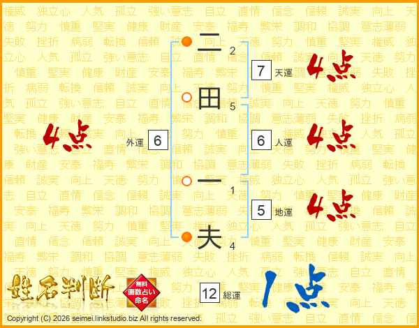 生活面を象徴する運勢です。外部から受ける影響力を表し、結婚運、家庭運や職場、環境への順応性を表します。総運から人運を引いた画数。姓や名が1文字の場合を除く。