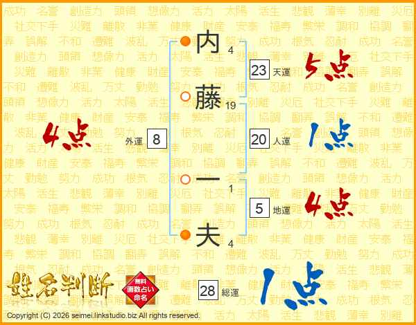 生活面を象徴する運勢です。外部から受ける影響力を表し、結婚運、家庭運や職場、環境への順応性を表します。総運から人運を引いた画数。姓や名が1文字の場合を除く。