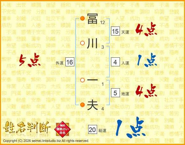 生活面を象徴する運勢です。外部から受ける影響力を表し、結婚運、家庭運や職場、環境への順応性を表します。総運から人運を引いた画数。姓や名が1文字の場合を除く。