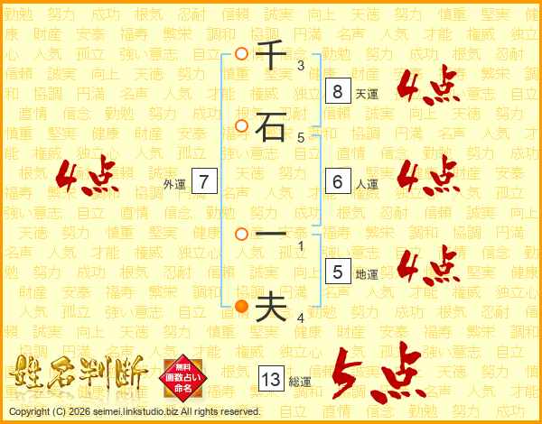 生活面を象徴する運勢です。外部から受ける影響力を表し、結婚運、家庭運や職場、環境への順応性を表します。総運から人運を引いた画数。姓や名が1文字の場合を除く。