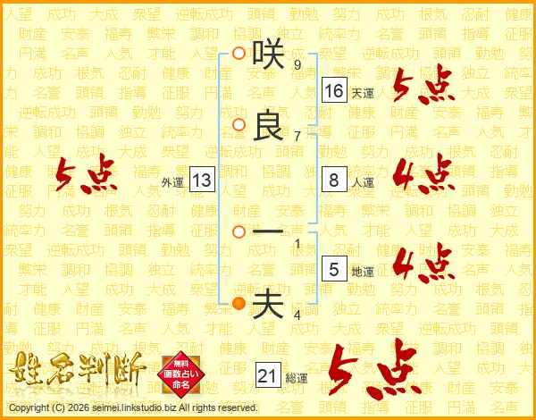 咲(9画)良(7画) 一(1画)夫(4画)