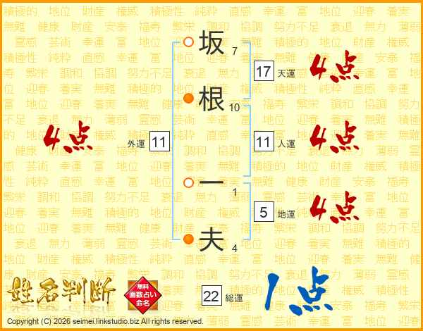 生活面を象徴する運勢です。外部から受ける影響力を表し、結婚運、家庭運や職場、環境への順応性を表します。総運から人運を引いた画数。姓や名が1文字の場合を除く。