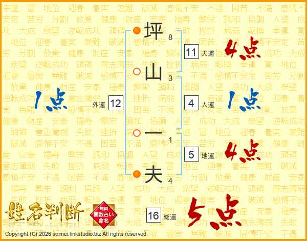 あなたの人生を表す1番重要な運勢です。生涯を通じて影響する総合運となり、主に50歳以降の晩年期に影響を及ぼします。苗字と名前の合計画数。