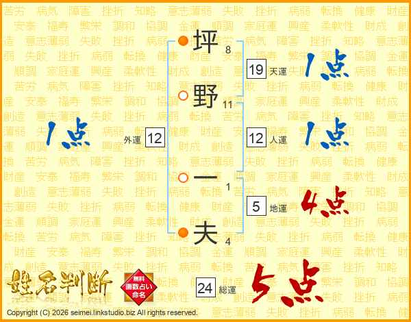 坪(8画)野(11画) 一(1画)夫(4画)