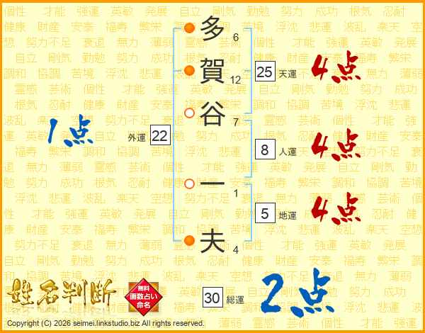 多(6画)賀(12画)谷(7画) 一(1画)夫(4画)