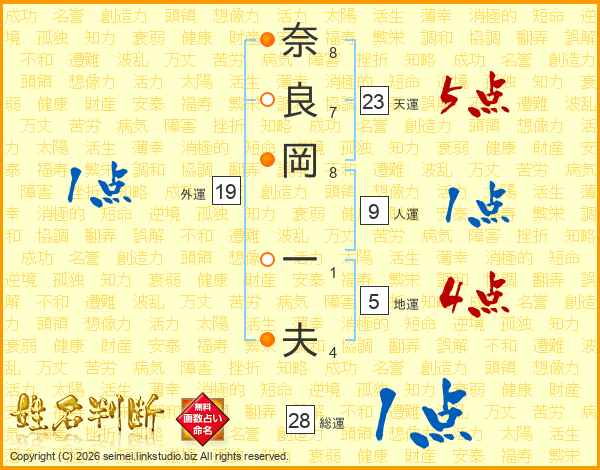 奈(8画)良(7画)岡(8画) 一(1画)夫(4画)