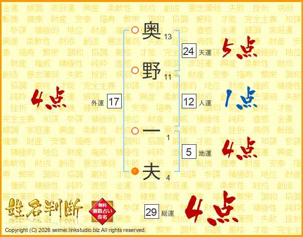 あなたの人生を表す1番重要な運勢です。生涯を通じて影響する総合運となり、主に50歳以降の晩年期に影響を及ぼします。苗字と名前の合計画数。