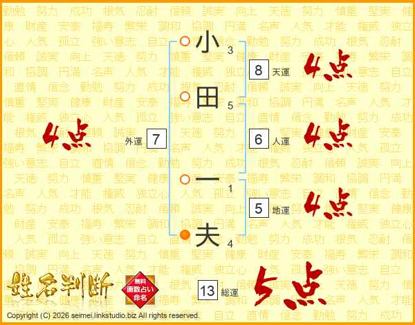 生活面を象徴する運勢です。外部から受ける影響力を表し、結婚運、家庭運や職場、環境への順応性を表します。総運から人運を引いた画数。姓や名が1文字の場合を除く。