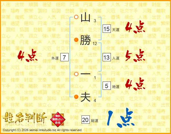 生活面を象徴する運勢です。外部から受ける影響力を表し、結婚運、家庭運や職場、環境への順応性を表します。総運から人運を引いた画数。姓や名が1文字の場合を除く。